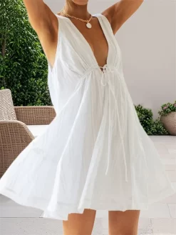 Women Summer Dress Solid Color Sleeveless V-Neck Tie-up A-Line Dress for Holiday Daily Beach Casual Clothes
