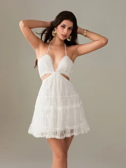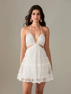 Women Lace White Dress Tie-Up Halter V-Neck Sleeveless Hollow-Out A-line Dress Summer Casual Bohemian Sexy Dresses
