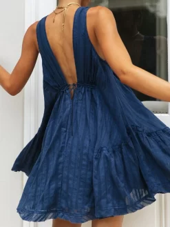 Women Summer Casual A-line Dress Solid Color Deep V-Neck Tie-Up Mini Dress Fashion Backless Tank Dress