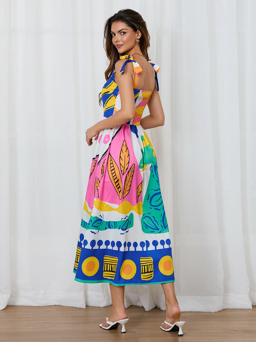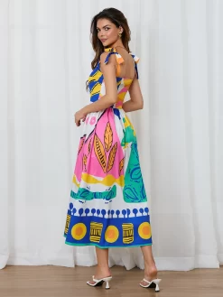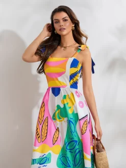 Women’s Summer Dress Tie-up Straps Sleeveless Square Neck Flowy Long Dress Beach Holiday Casual Loose Streetwear