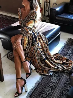 Women Bohemian Dress Vintage Print Long Sleeve V Neck Loose Split Dress Party Sexy Elegant Beach Dresses Female